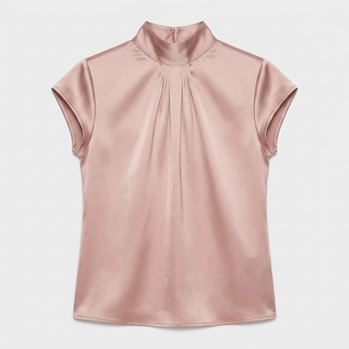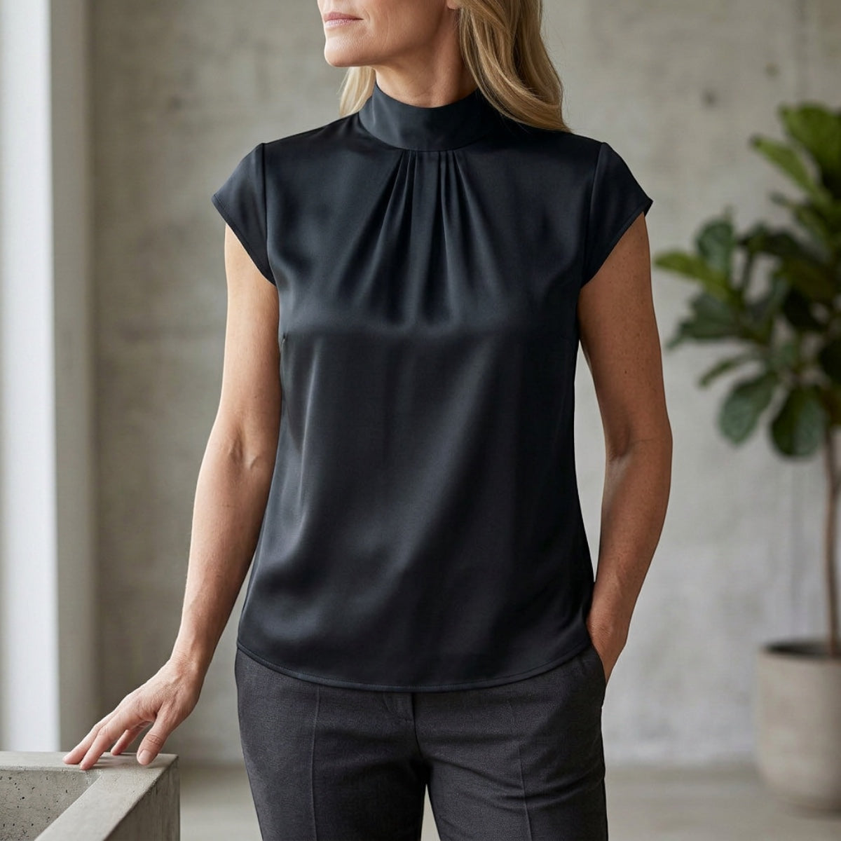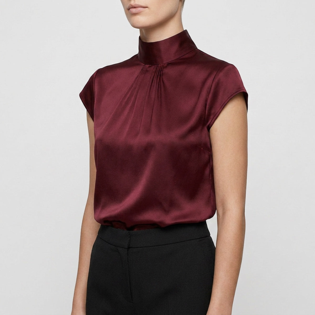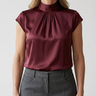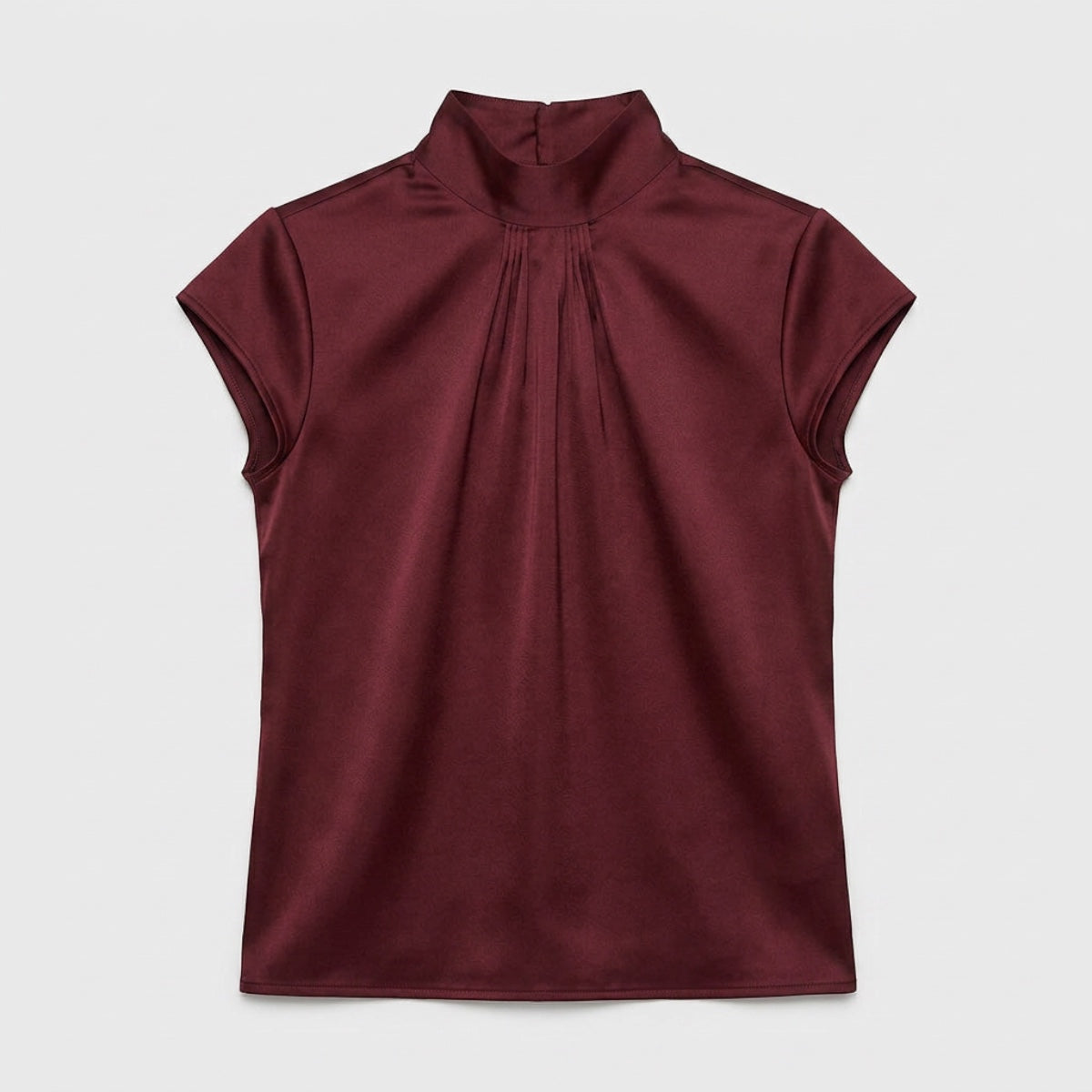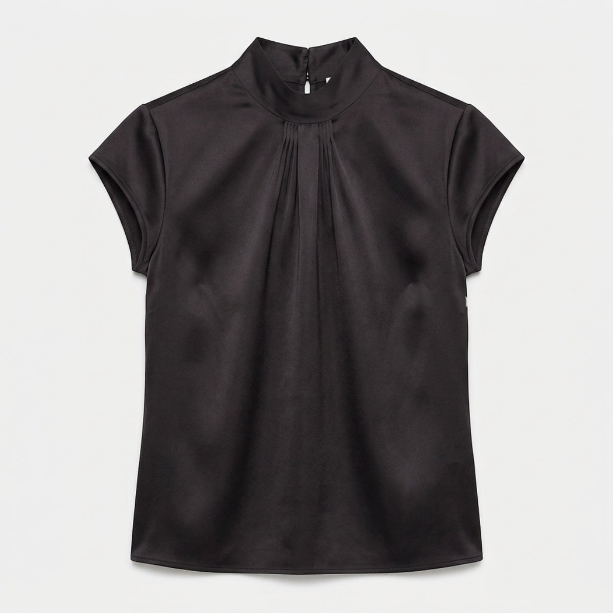 Cette blouse se distingue par son col montant orné de plis délicats qui créent un point focal élégant au niveau du décolleté. La coupe fluide épouse la silhouette sans la contraindre, tandis que les manches courtes à bords arrondis apportent une touche féminine. Le tombé satiné offre un effet visuel sophistiqué adapté aux occasions habillées.
