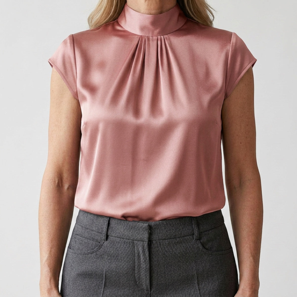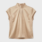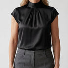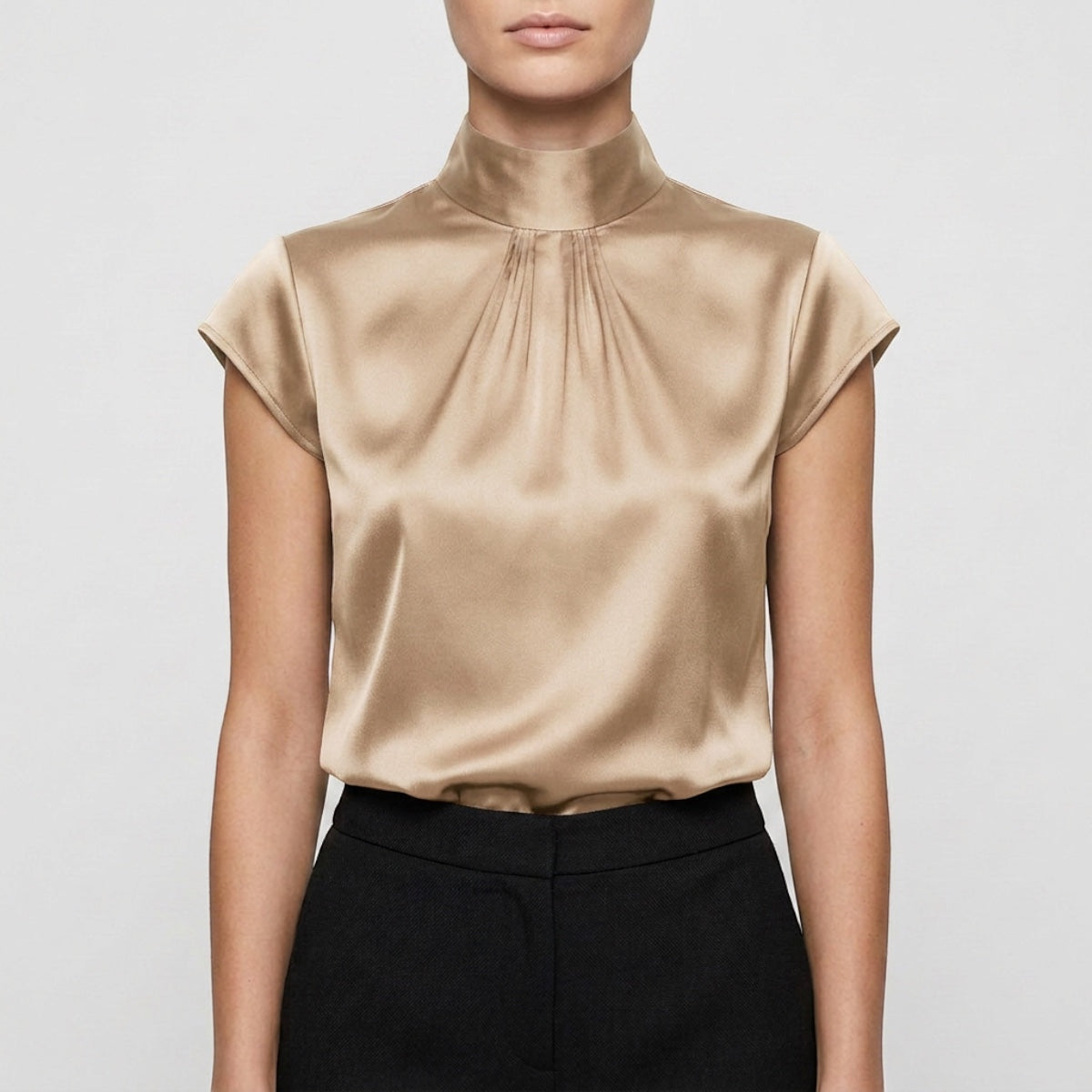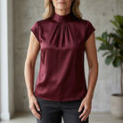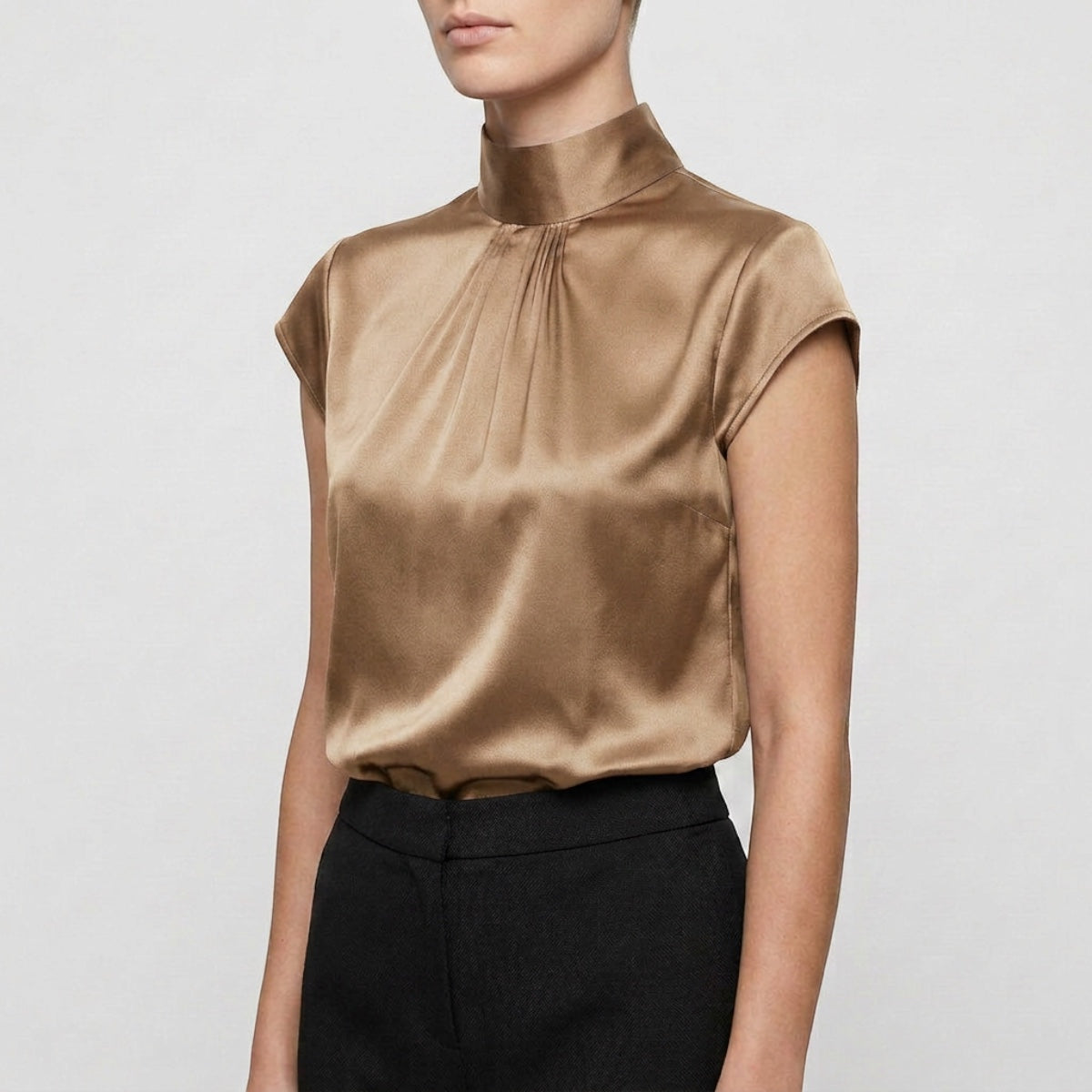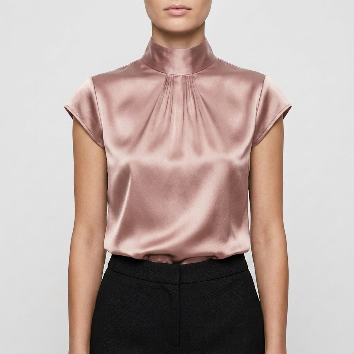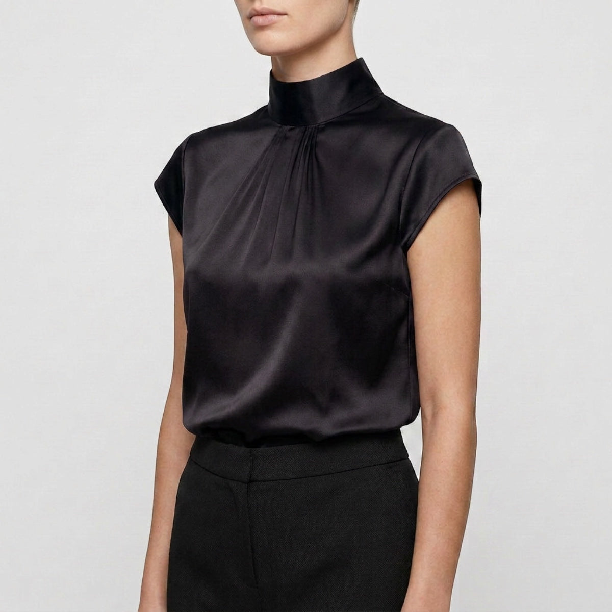 Cette blouse se distingue par son col montant orné de plis délicats qui créent un point focal élégant au niveau du décolleté. La coupe fluide épouse la silhouette sans la contraindre, tandis que les manches courtes à bords arrondis apportent une touche féminine. Le tombé satiné offre un effet visuel sophistiqué adapté aux occasions habillées.
