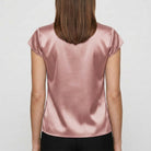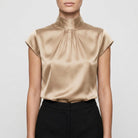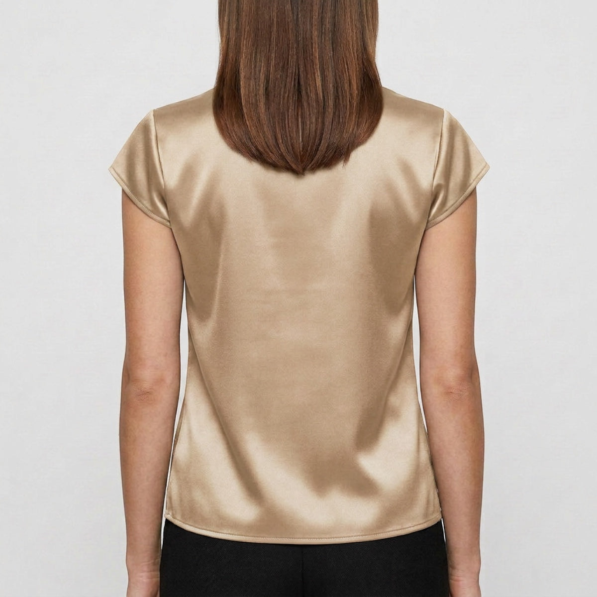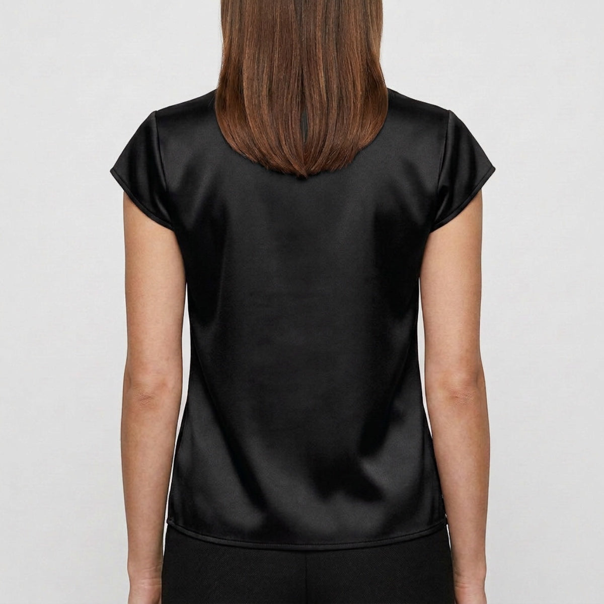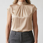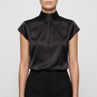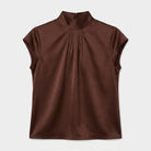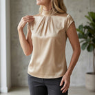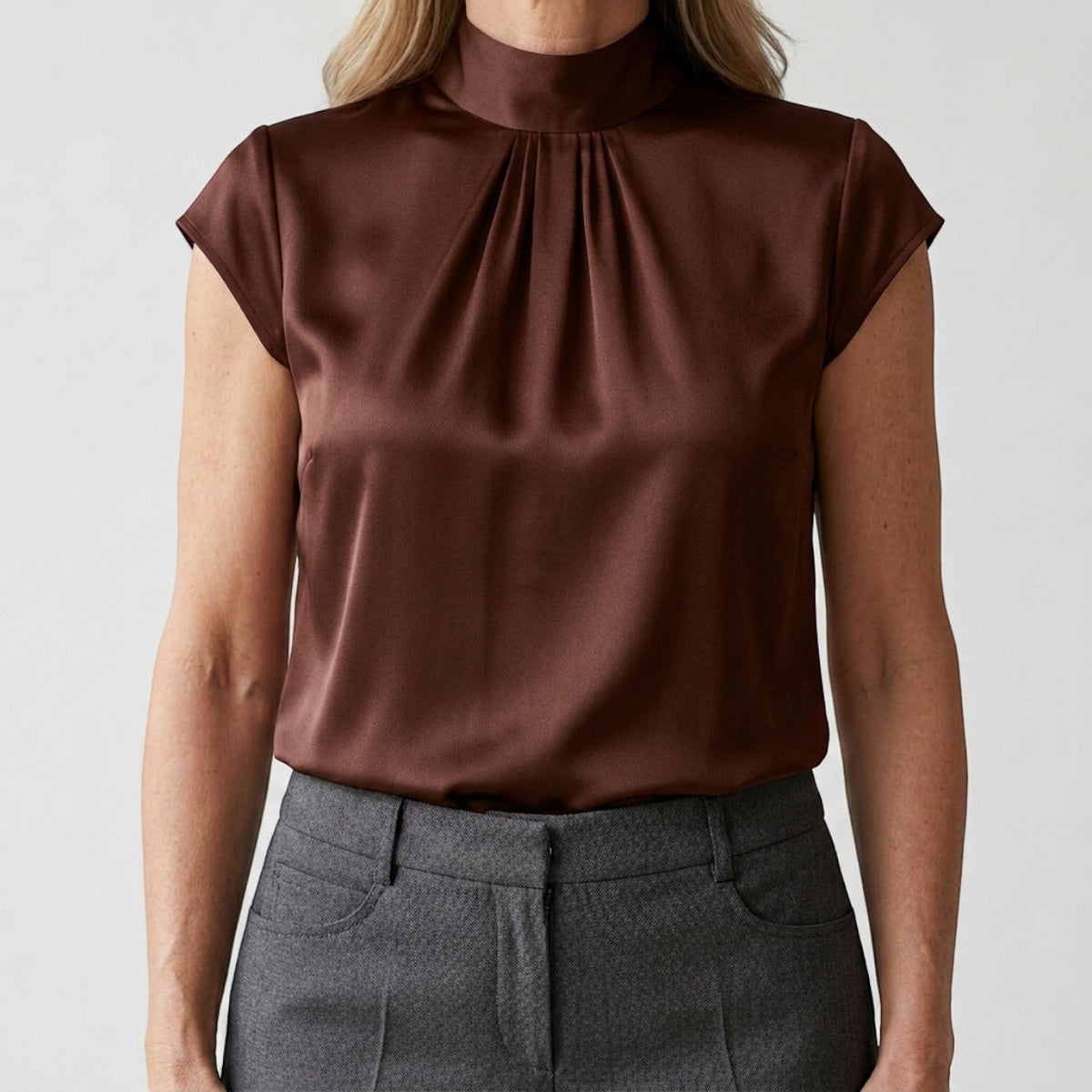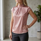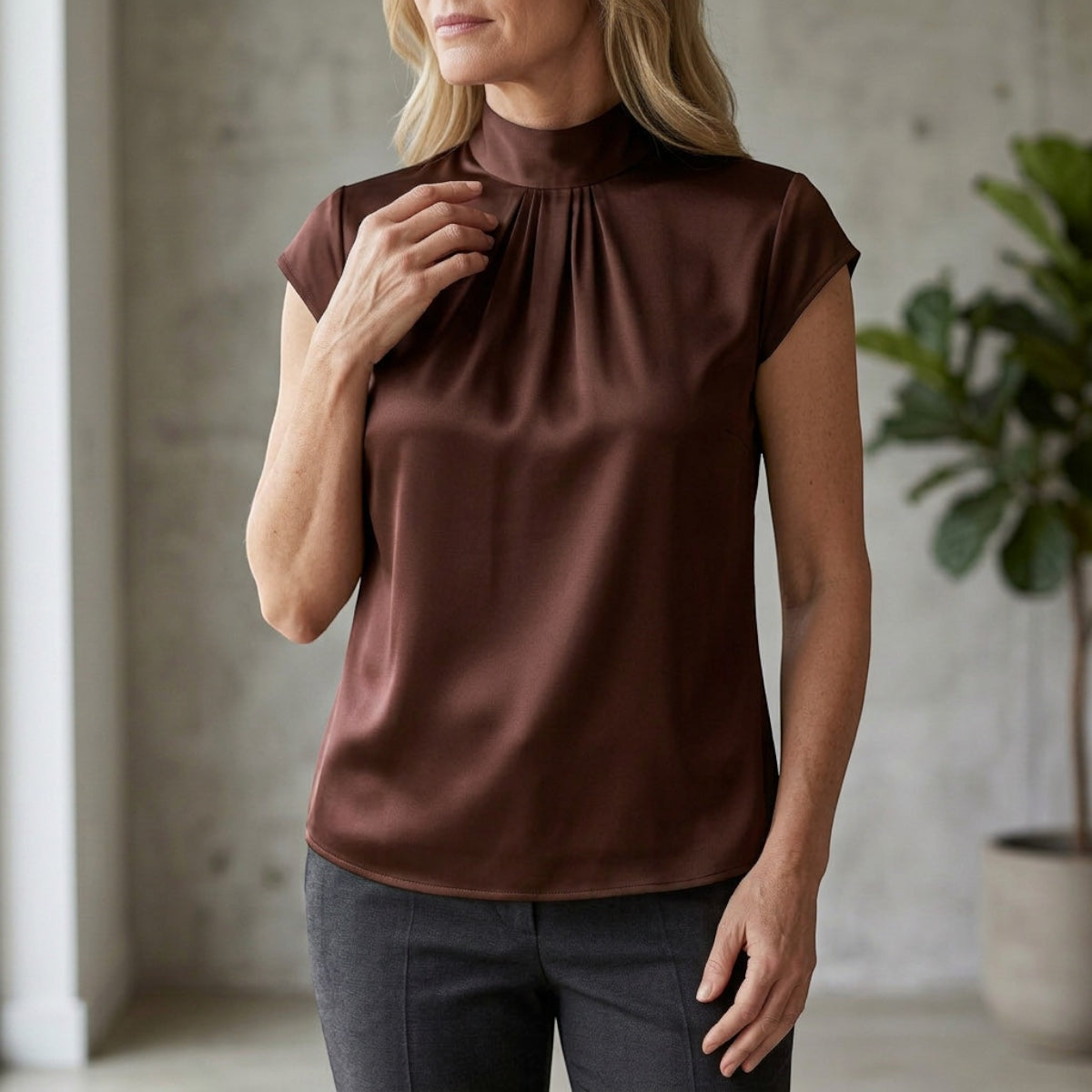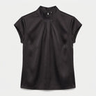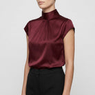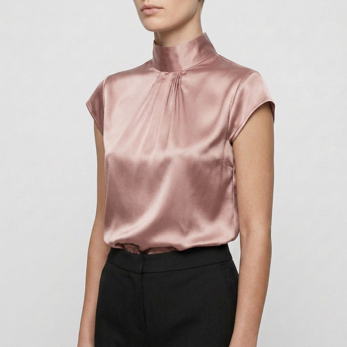Cette blouse se distingue par son col montant orné de plis délicats qui créent un point focal élégant au niveau du décolleté. La coupe fluide épouse la silhouette sans la contraindre, tandis que les manches courtes à bords arrondis apportent une touche féminine. Le tombé satiné offre un effet visuel sophistiqué adapté aux occasions habillées.