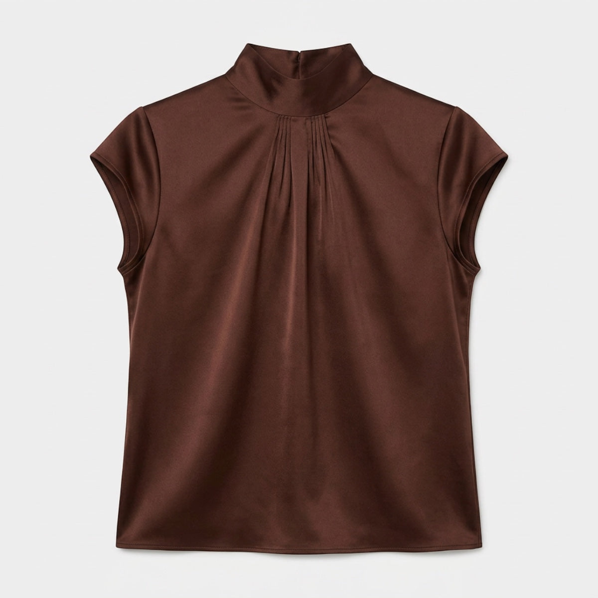 Col montant avec plissé central — attire le regard vers le haut et allonge visuellement le cou pour une allure distinguée.